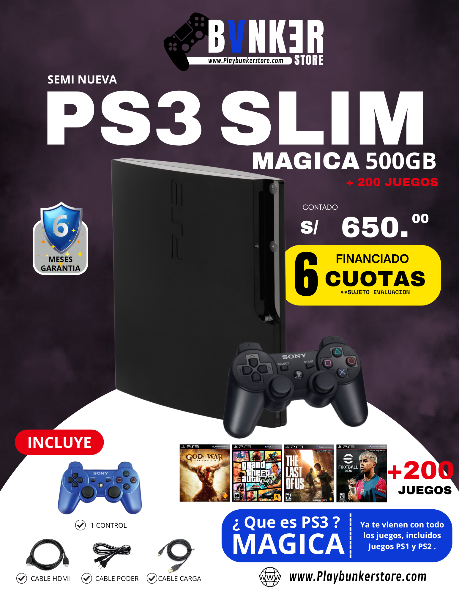 CONSOLA PLAYSTATION 3 SLIM 500 GB MAGICA-SEMI NUEVA